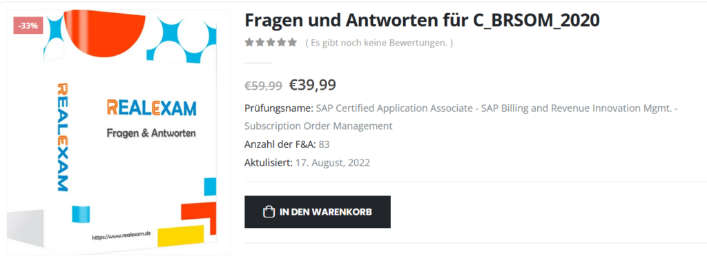 Die Braindumps zu der Prüfung C_BRSOM_2020 „SAP Certified Application Associate – SAP Billing and Revenue Innovation Mgmt. – Subscription Order Management“ bei Realexam wurden am 17. August 2022 aktualisiert und enthalten 83 Fragen. Alle Antworten wurden vom Top-Team von Realexam überprüft. Die hilfreichen Braindumps helfen Ihnen, in der Prüfung C_BRSOM_2020 sehr gute Bemerkungen zu machen. Ihre Vorbereitung ist am effektivsten und Sie werden bei den Prüfungsfragen die maximalen Endergebnisse erzielen. Wir stellen sicher, dass Sie die SAP Prüfung im ersten Anlauf erfolgreich bestehen.